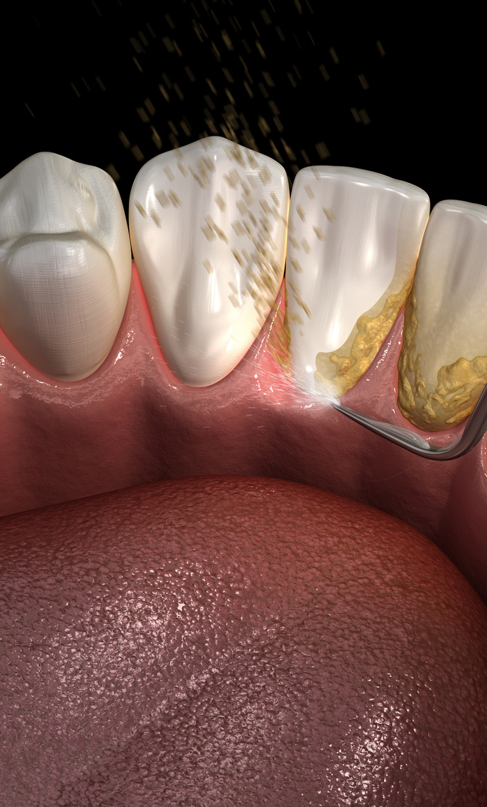 Removal of plaque and tartar from above and below the gumline using hand instruments or an ultrasonic scaler.